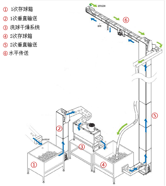 • 送球装置(水平传送带)运球,通过送球管道运至球箱里储藏(约 1600个)。