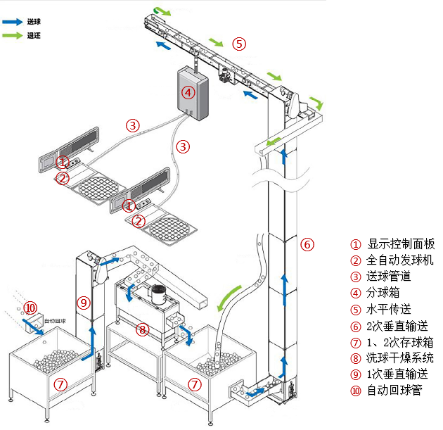 全自动供球系统的主要构成由多个自动化设备的组合,1到4打位区域设备,5到6水平垂直输送设备,7到9 洗球干燥设备,10自动回球设备,客户可选择部分或全部功能来安装此设备,并通过计算机管理系统对设备及日常运营进行管理,另有微信小程序功能使客户使用更加便捷。