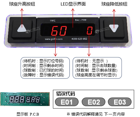 e 按“▲”或“▼”按钮时球数显示器会显示球座的高度,调整好高度打出一个球后,继续显示球数。
